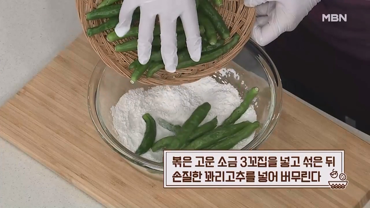 3. 볶은 고운 소금 3꼬집을 넣고 섞은 뒤 손질한 꽈리고추를 넣어 버무립니다.