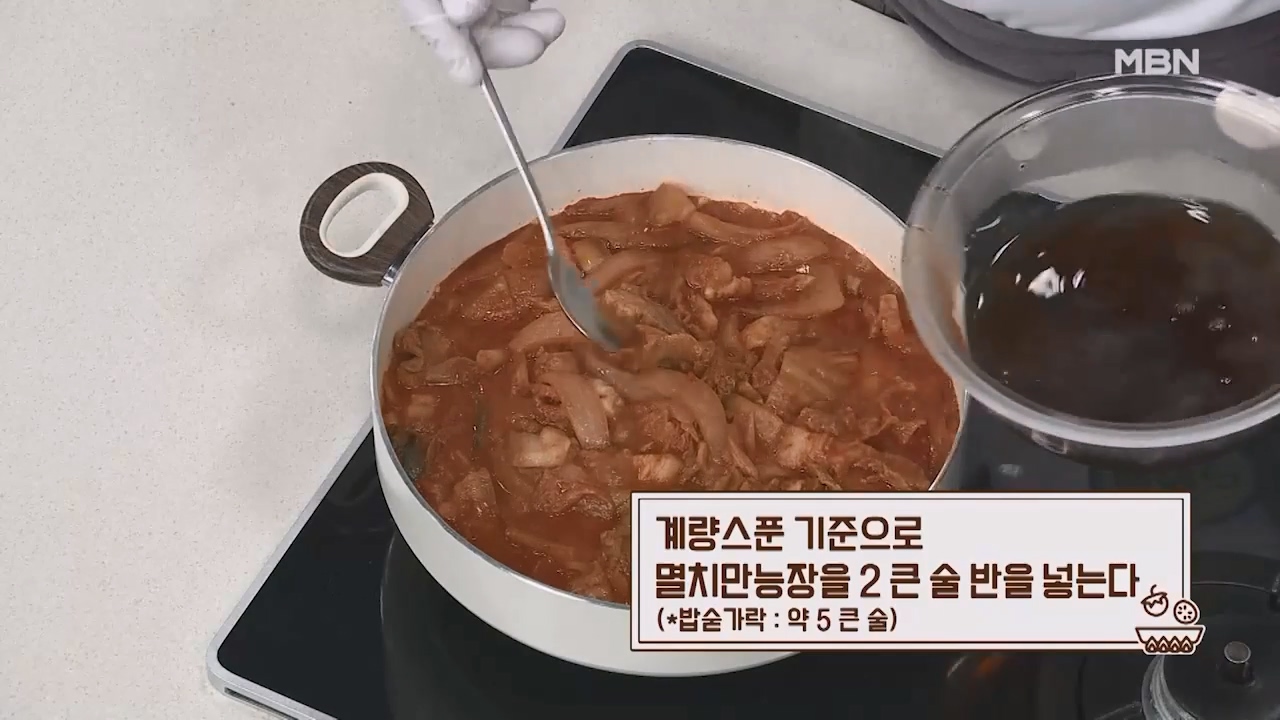 11. 계량스푼 기준으로 멸치 만능장을 2큰술 반을 넣어 끓이면 맛있는 돼지고기 김치찜이 완성됩니다. (밥숟가락 약 5큰술)