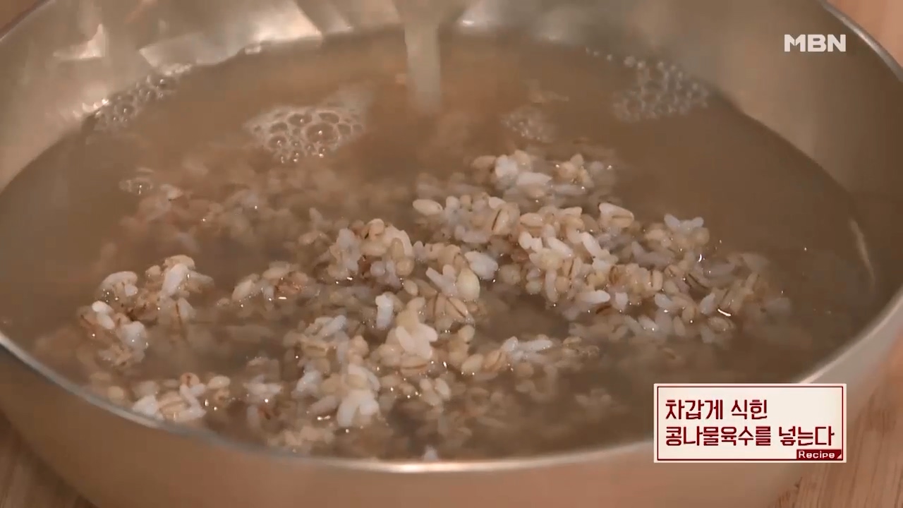 13. 차갑게 식힌 도토리묵육수를 보리밥이 담긴 그릇에 부어줍니다.