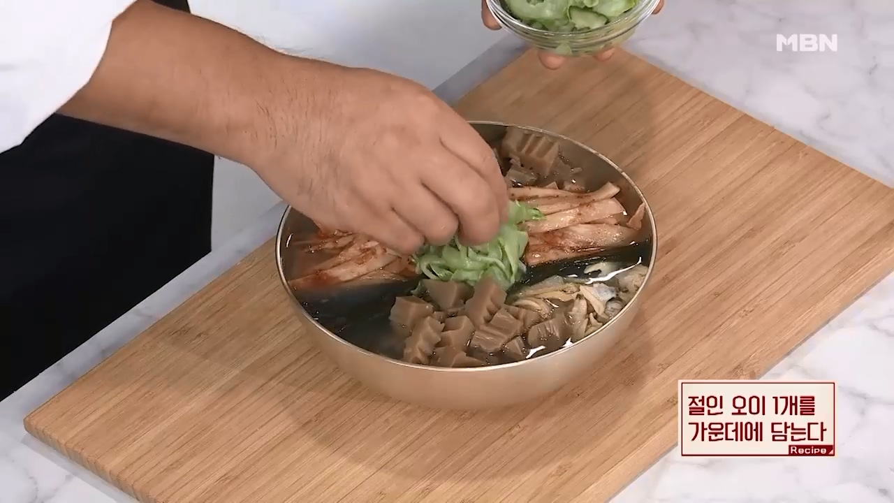 15. 육수 낼때 쓴 다시마를 채 썰어 마주 보게 담아줍니다.