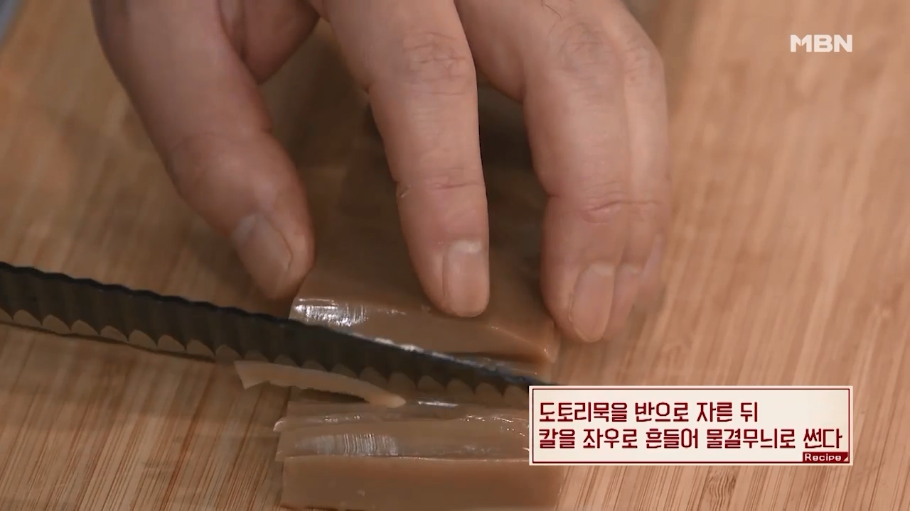 1. 도토리묵은 칼 앞날을 도마에 고정시키고 좌우로 흔들면서 잘라 물결무늬가 나오게 도토리묵을 잘라줍니다.