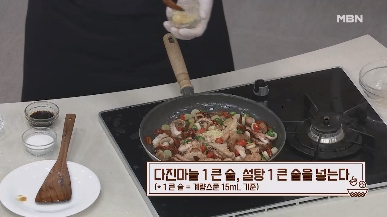 13. 다진마늘 1큰술, 설탕 1큰술을 넣어줍니다. (1큰술은 계량스푼 15mL 기준)