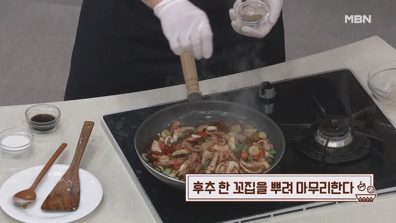14. 후추 한 꼬집을 뿌려 마무리 하면 맛있는 백쭈삼볶음이 완성됩니다.