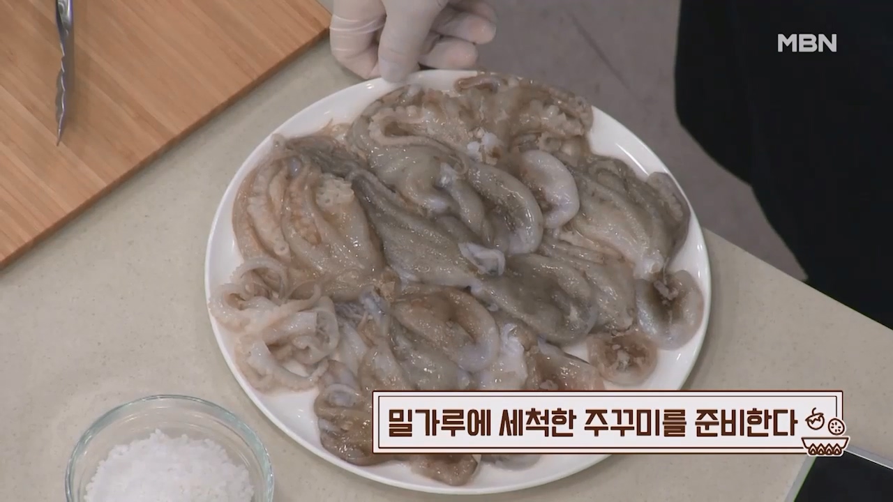 1. 밀가루에 세척한 주꾸미를 준비합니다.