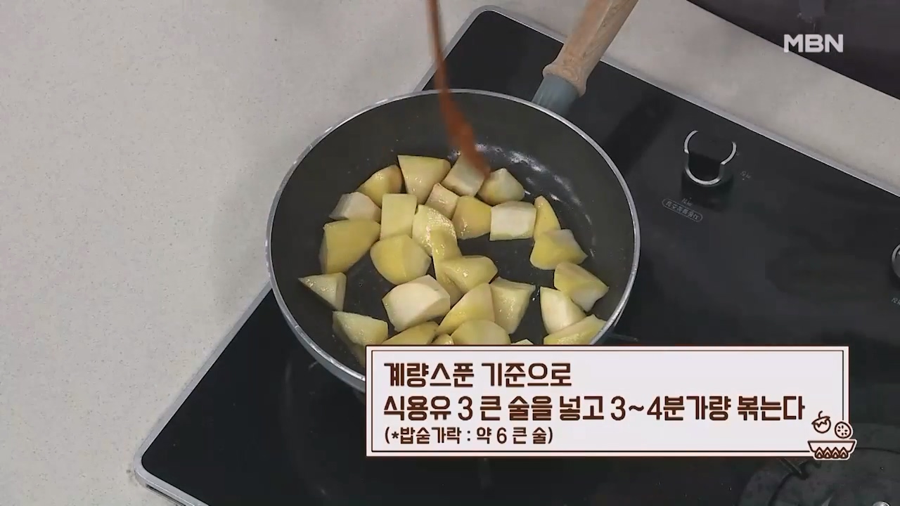 4. 계량스푼 기준으로 식용유 3큰술을 넣고 3~4분 가량 볶아줍니다. (밥숟가락 약 6큰술)