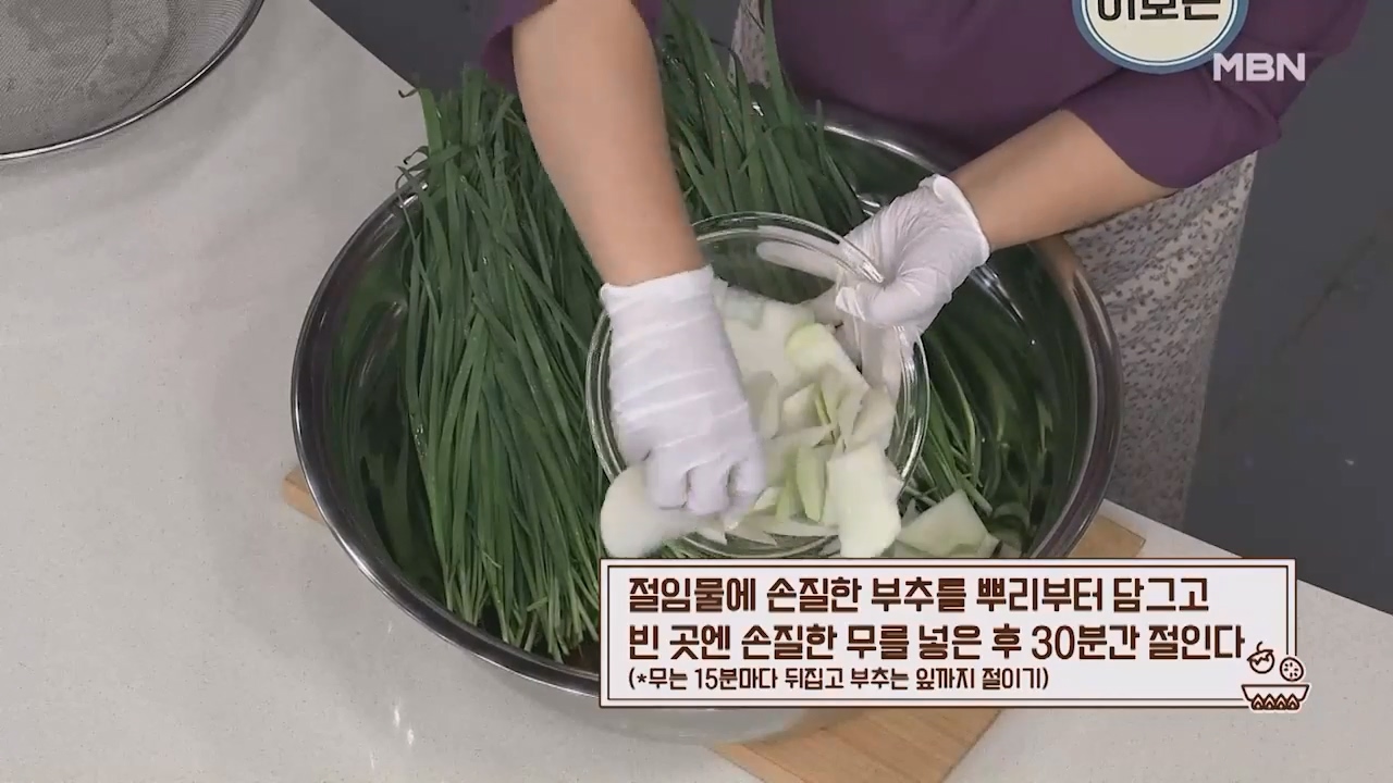 5. 절임물에 손질한 부추를 뿌리부터 담그고 빈 곳엔 손질한 무를 넣은 후 30분간 절여줍니다. (무는 15분 마다 뒤집어주고 부추는 잎까지 절여줍니다.)