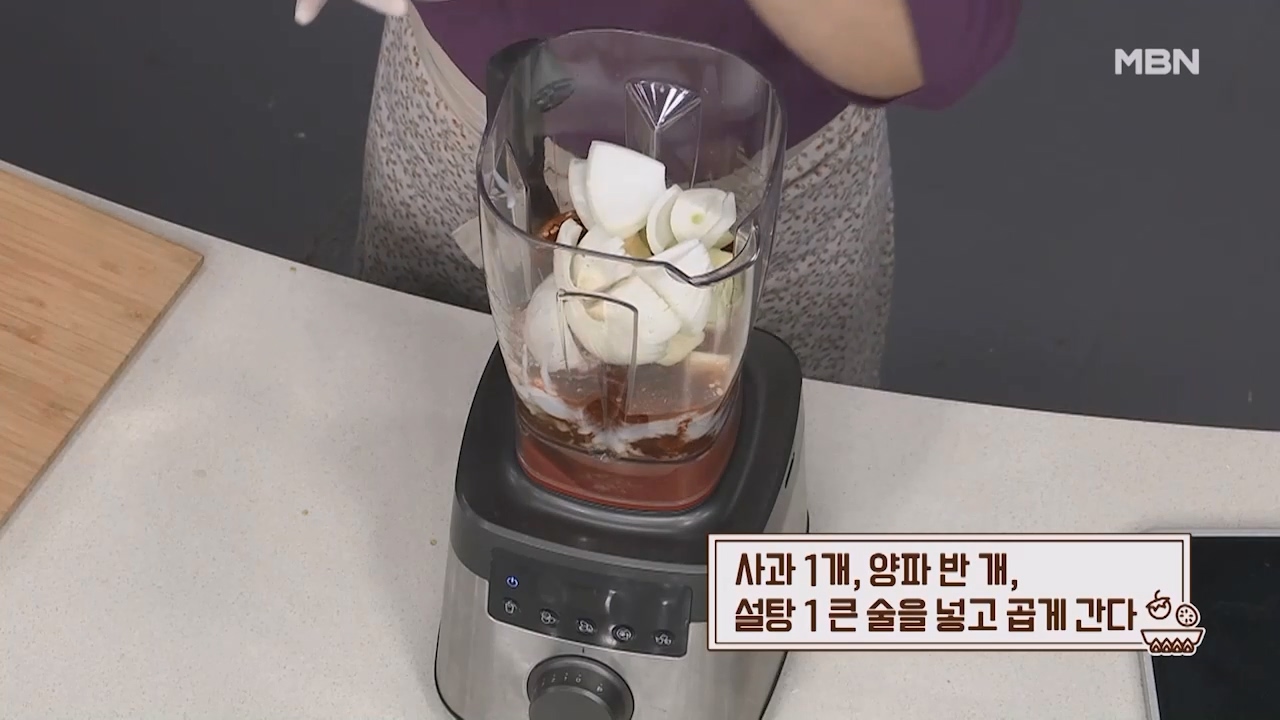 8. 사과 1개, 양파 반개, 설탕 1큰술을 넣고 곱게 갈아줍니다.