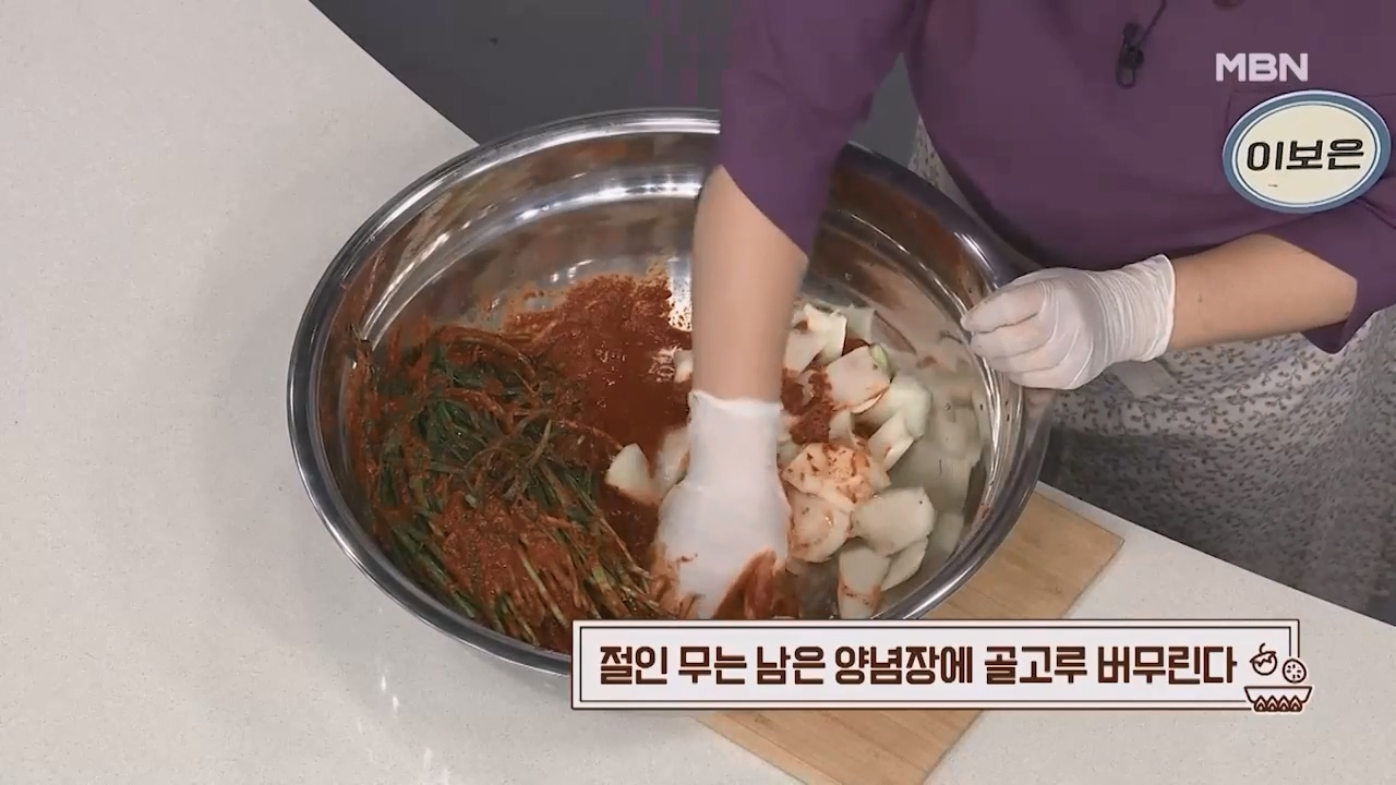 12. 절인 무는 남은 양념장에 골고루 버무려줍니다.