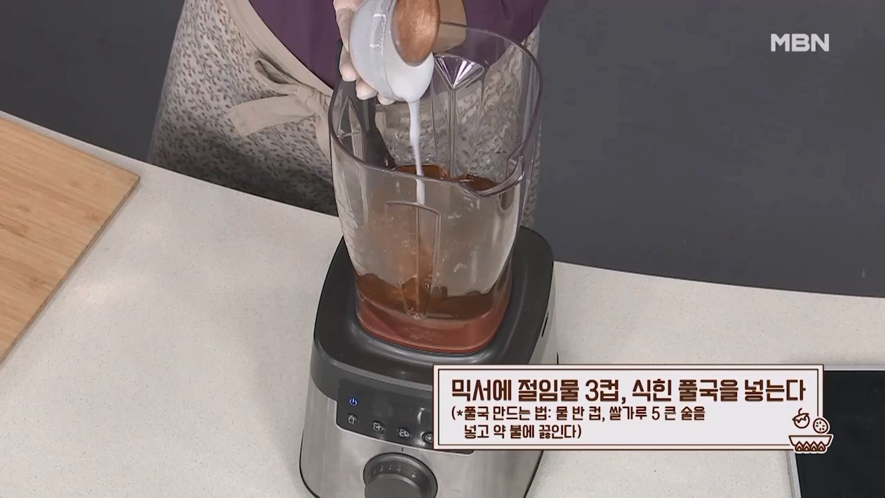6. 믹서기에 절임물 3컵과 식힌 풀국을 넣어줍니다. (풀국 만드는법은 물 반컵, 쌀가루 5큰술을 넣고 약불에 끓여서 만들어 식혀서 사용합니다.)