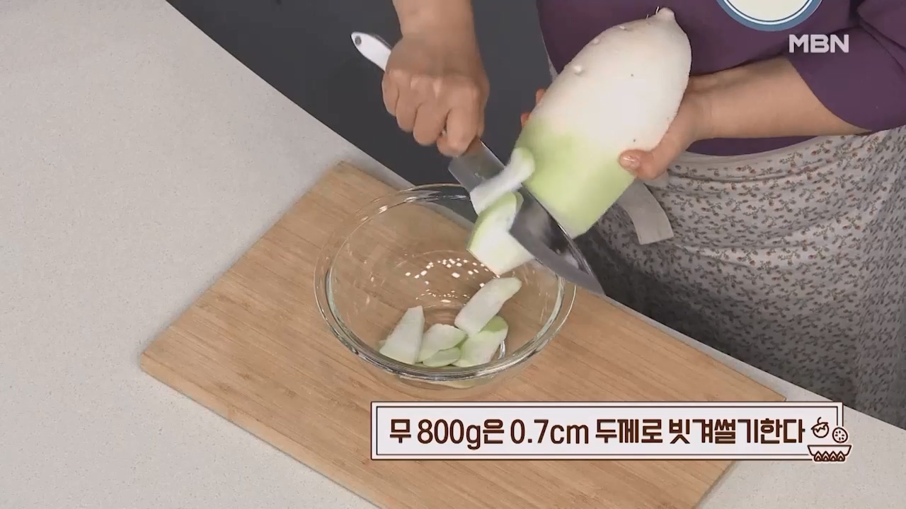 3. 무 800g은 0.7cm 두께로 빗겨썰어줍니다.