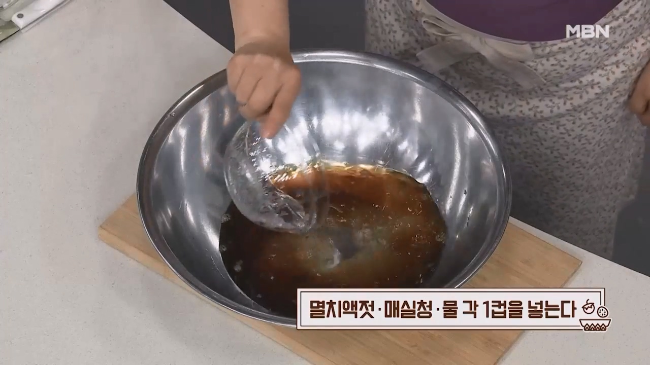 4. 볼에 멸치액젓 1컵, 매실청 1컵, 물 1컵을 넣어줍니다.
