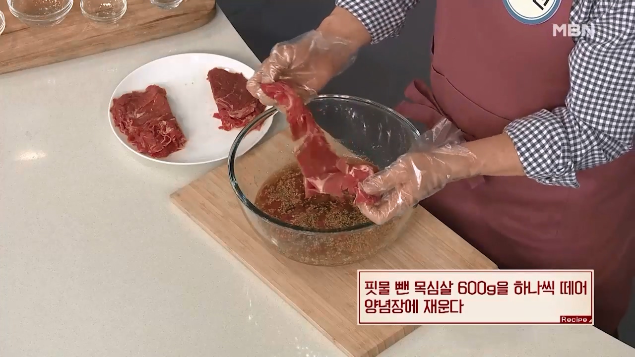 6. 핏물 뺀 목심살 600g을 하나씩 떼어 양념장에 재웁니다.