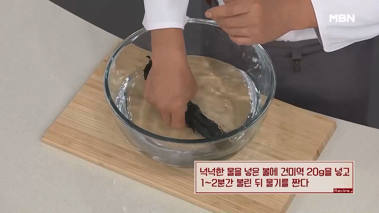 2. 넉넉한 물을 넣은 볼에 건미역 20g을 넣고 1~2분간 불린 뒤 물기를 짭니다.