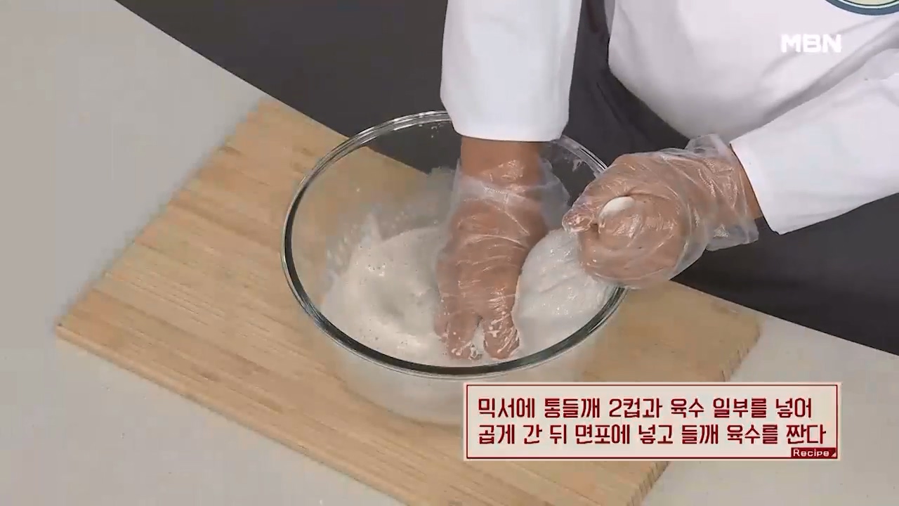 7. 믹서기에 통들깨 2컵과 육수 일부를 넣어 곱게 간 뒤 면포에 넣고 들깨 육수를 짜줍니다.