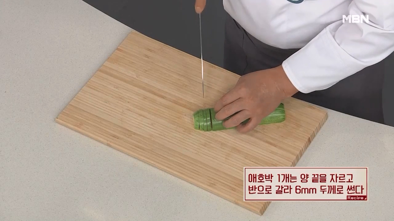 1. 애호박 1개의 양 끝을 자르고 반으로 갈라 6mm 두께로 썰어줍니다.