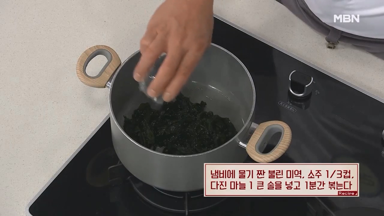 3. 냄비에 물기 짠 불린 미역과 소주 1/3컵, 다진마늘 1큰술을 넣고 1분간 볶아줍니다.