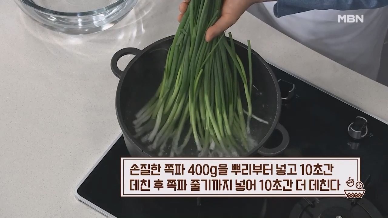 2. 손질한 쪽파 400g을 뿌리부터 넣고 10초간 데친 후 쪽파 줄기까지 넣어 10초간 더 데쳐줍니다.