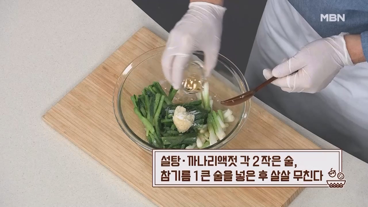 5. 데친 쪽파에 국간장 1큰술, 다진마늘 1큰술을 넣어줍니다.