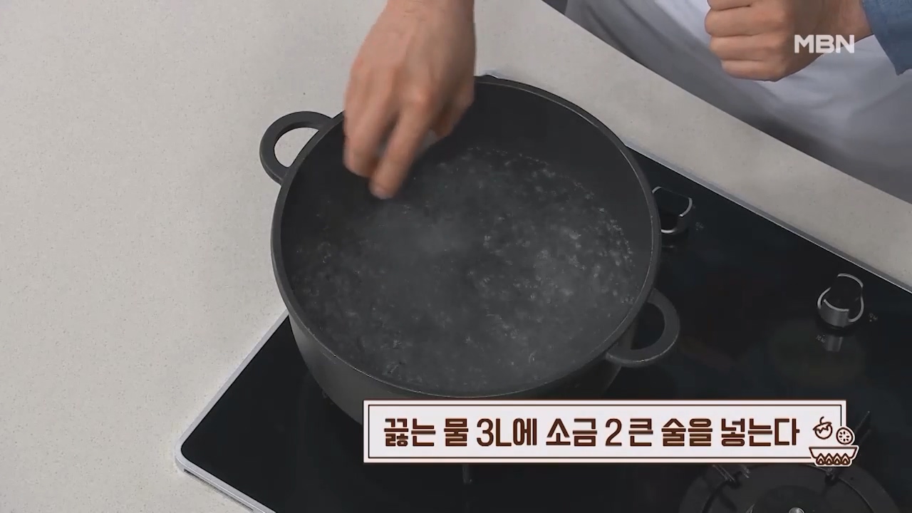 1. 끓는 물 3리터에 소금 2큰술을 넣습니다.