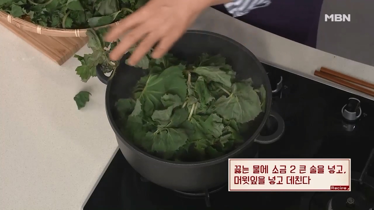 1. 끓는 물에 소금 2큰술을 넣고 머윗잎을 넣고 데쳐줍니다.