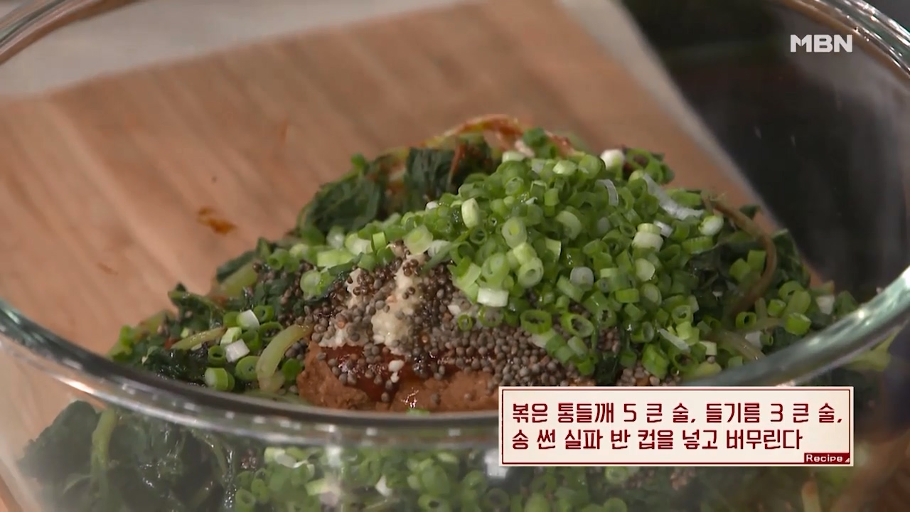6. 볶은 통들깨 5큰술, 들기름 3큰술, 송송 썬 실파 반컵을 넣고 버무리면 맛있는 머위나물무침이 완성됩니다.