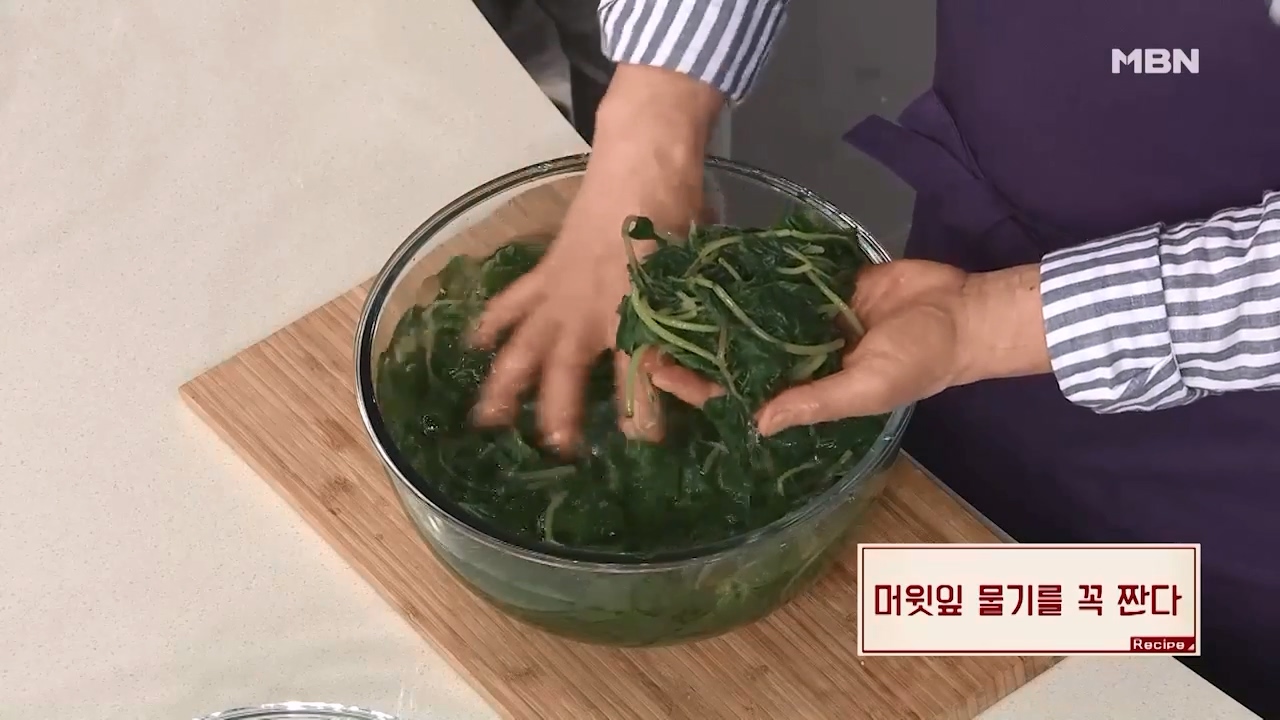 3. 찬물에 헹군 머윗잎의 물기를 꽉 짜줍니다.