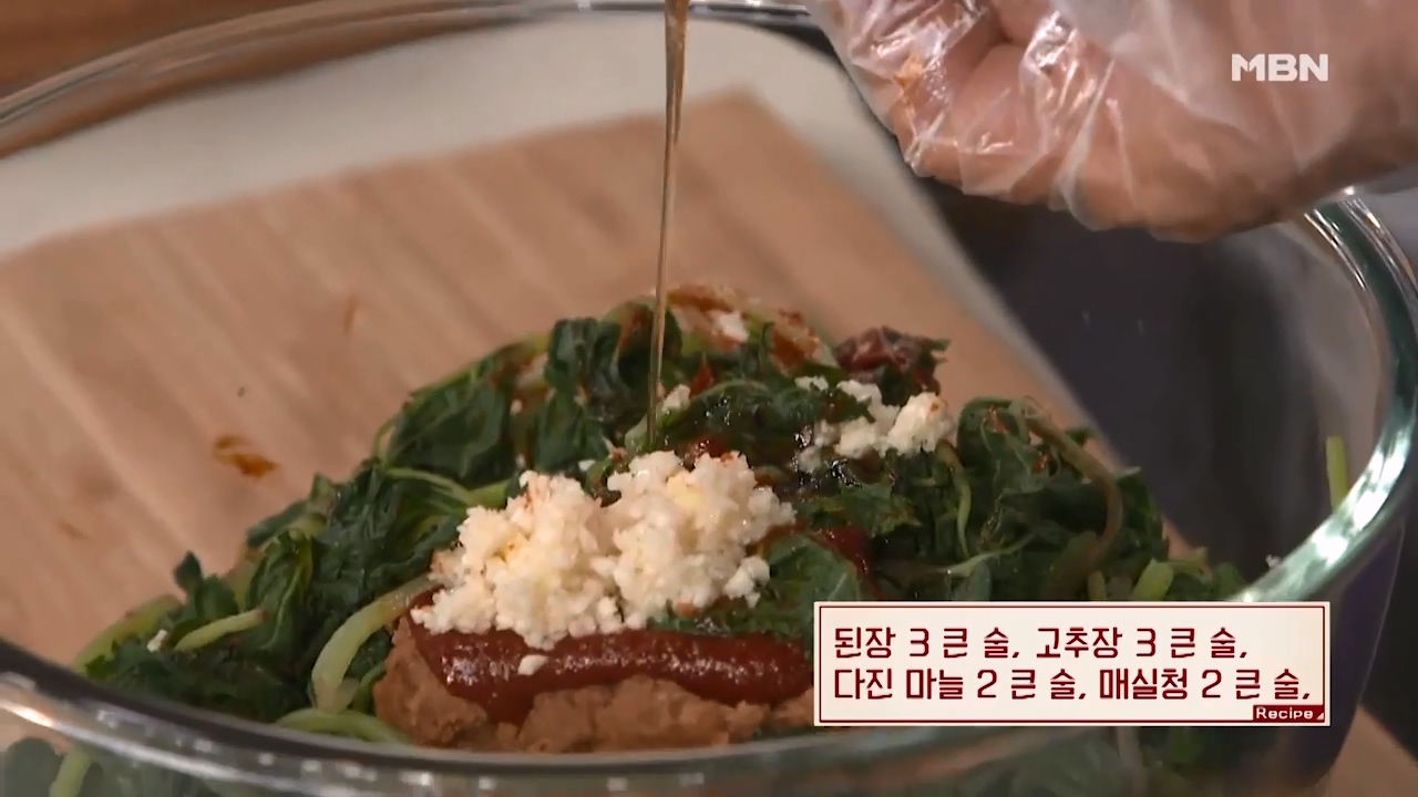 5. 볼에 머윗잎을 넣고 된장 3큰술, 고추장 3큰술, 다진 마늘 2큰술, 매실청 2큰술을 넣습니다.