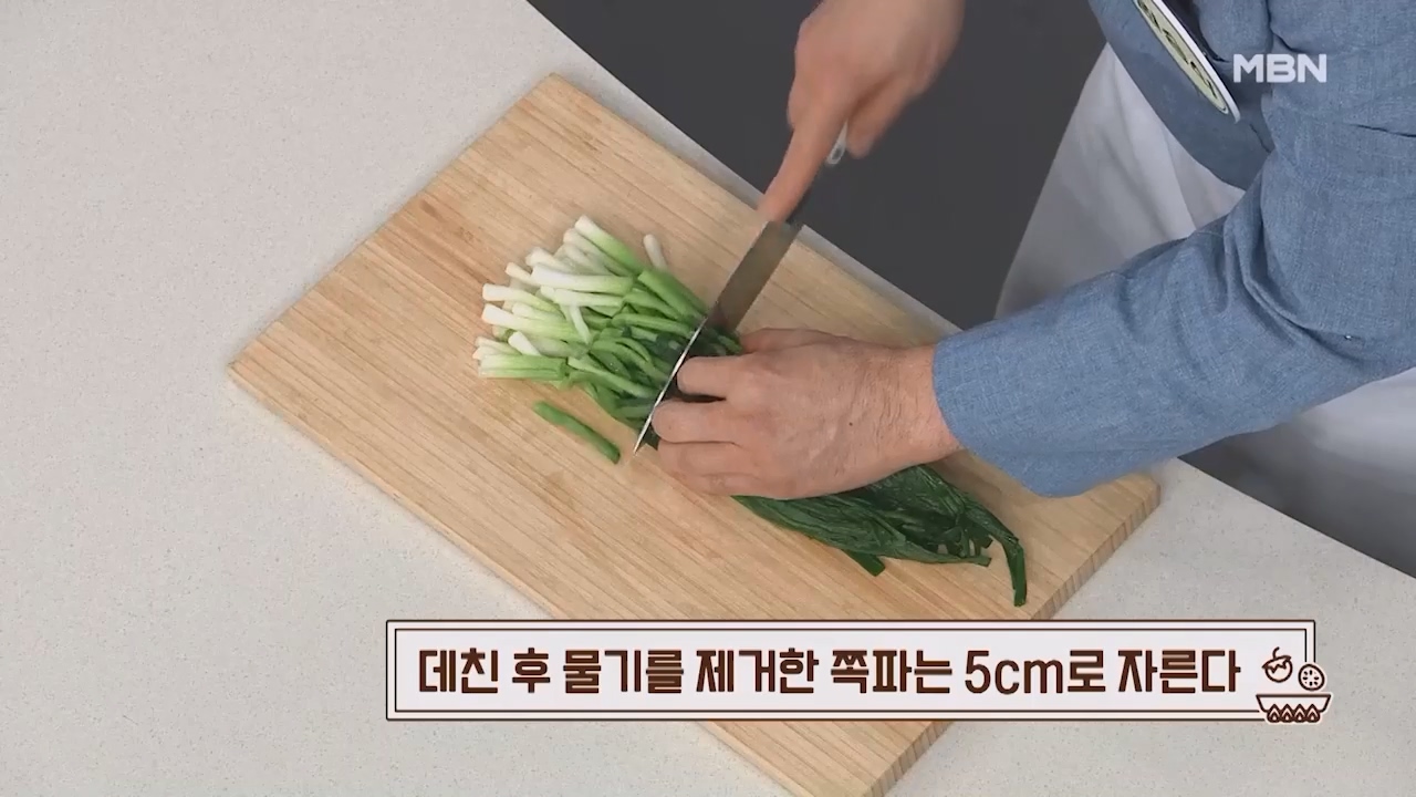 4. 데친 후 물기를 제거한 쪽파는 5cm로 잘라줍니다.