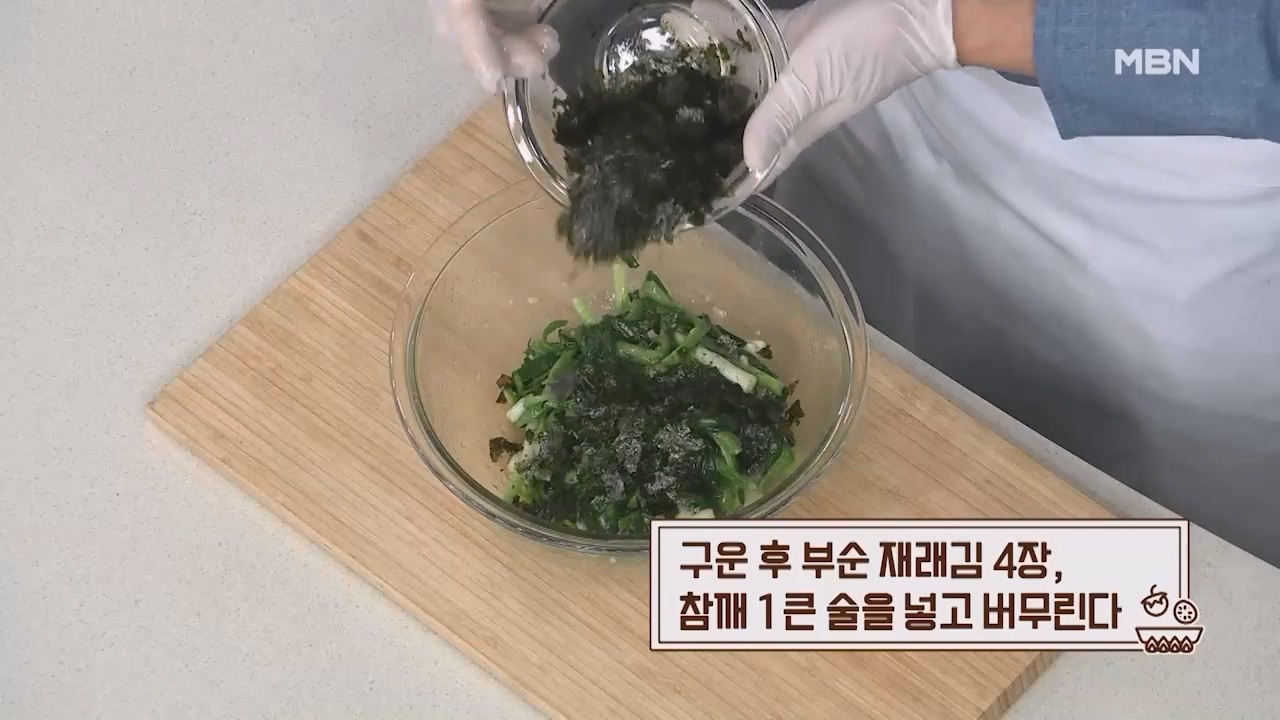 7. 구운 후 부순 재래김 4장, 참깨 1큰술을 넣고 버무려주면 김쪽파나물이 완성됩니다.