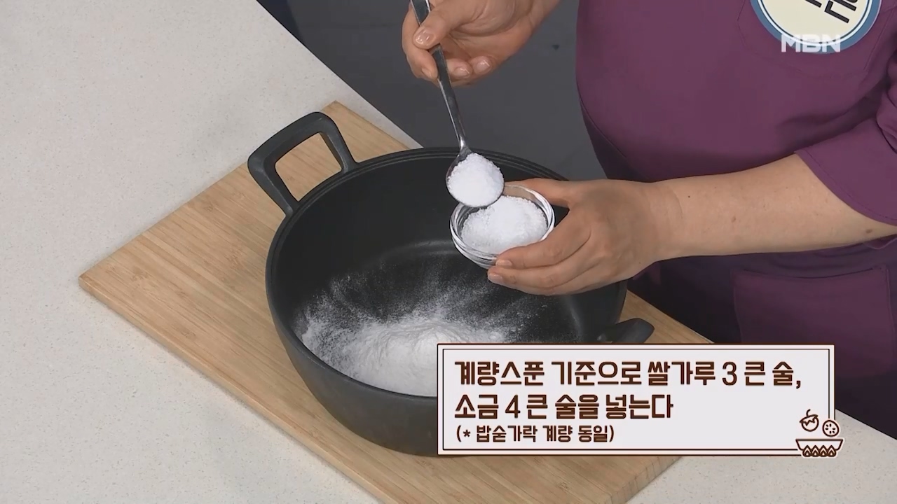 5. 계량스푼 기준으로 쌀가루 3큰술, 소금 4큰술을 넣어줍니다. (밥숟가락 계량 동일)