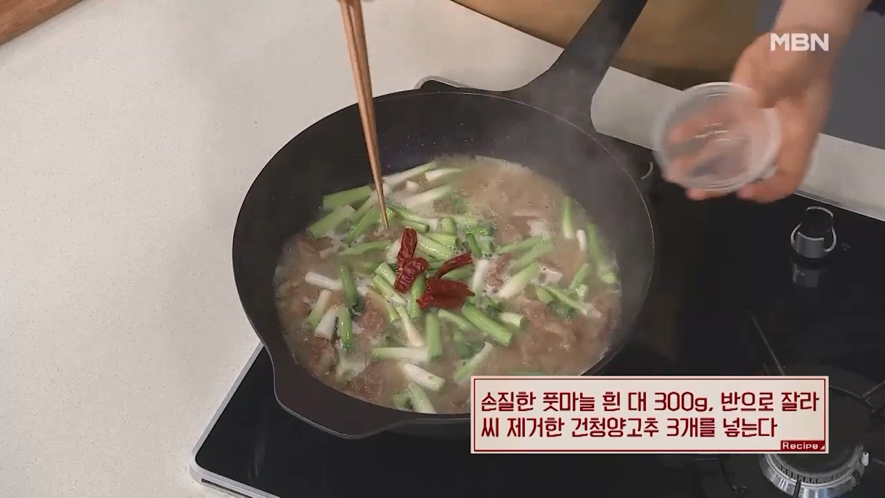 6. 손질한 풋마늘 흰대 300g, 반으로 잘라 씨 제거한 건청양고추 3개를 넣어줍니다.