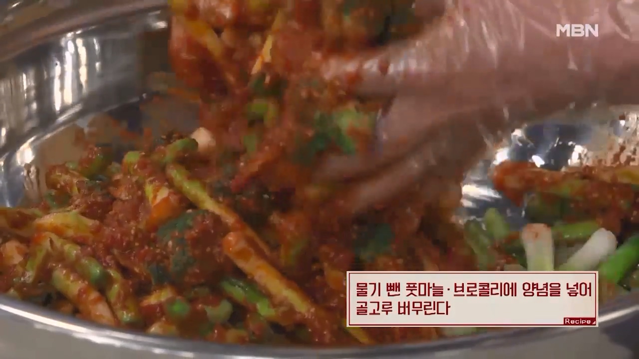 18. 물기 뺀 풋마늘과 브로콜리에 양념을 넣어 골고루 버무리면 맛있는 풋마늘 김치가 완성됩니다.