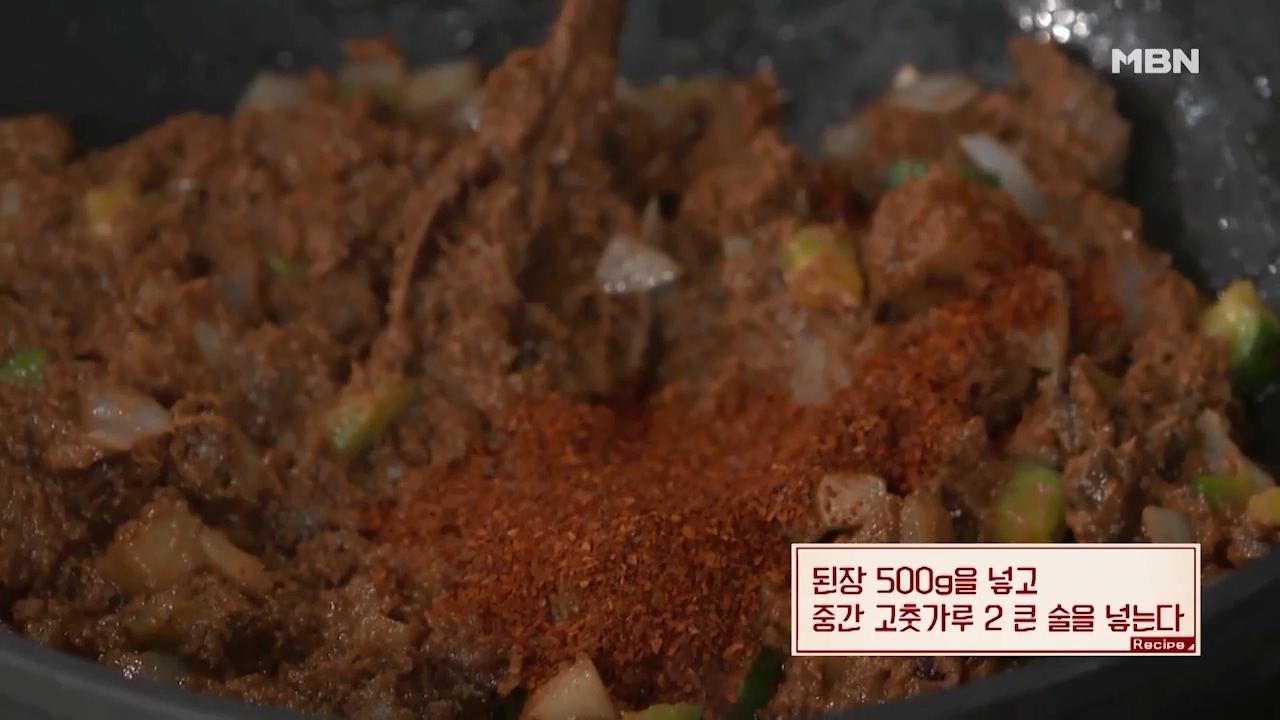 4. 된장 500g을 넣고 중간 고춧가루 2큰술을 넣어줍니다.