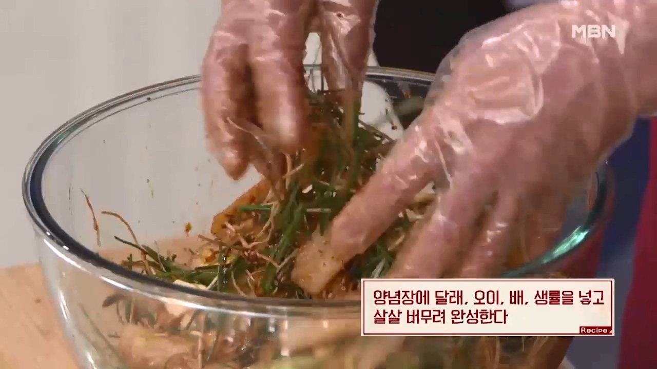 7. 달래무침 양념장에 달래와 오이, 배, 생률을 넣고 살살 버무리면 맛있는 달래무침이 완성됩니다.
