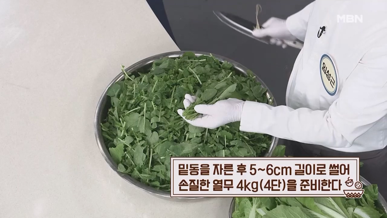 1. 밑동을 자른 후 5~6cm길이로 썰어 손질한 열무 4kg(4단)을 준비합니다.