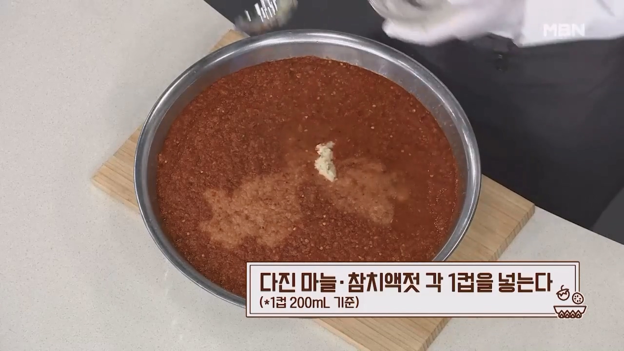 7. 믹서기에 간 열무얼갈이김치 양념에 다진 마늘1컵, 참치액젓 1컵을 넣어줍니다. (1컵 200mL 기준)