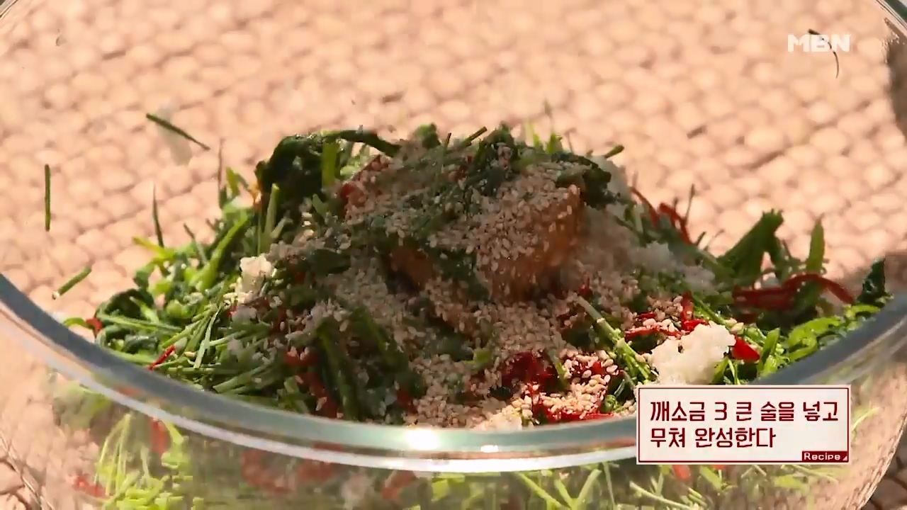 7. 깨소금 3큰술을 넣고 무쳐 열무된장무침을 완성합니다.