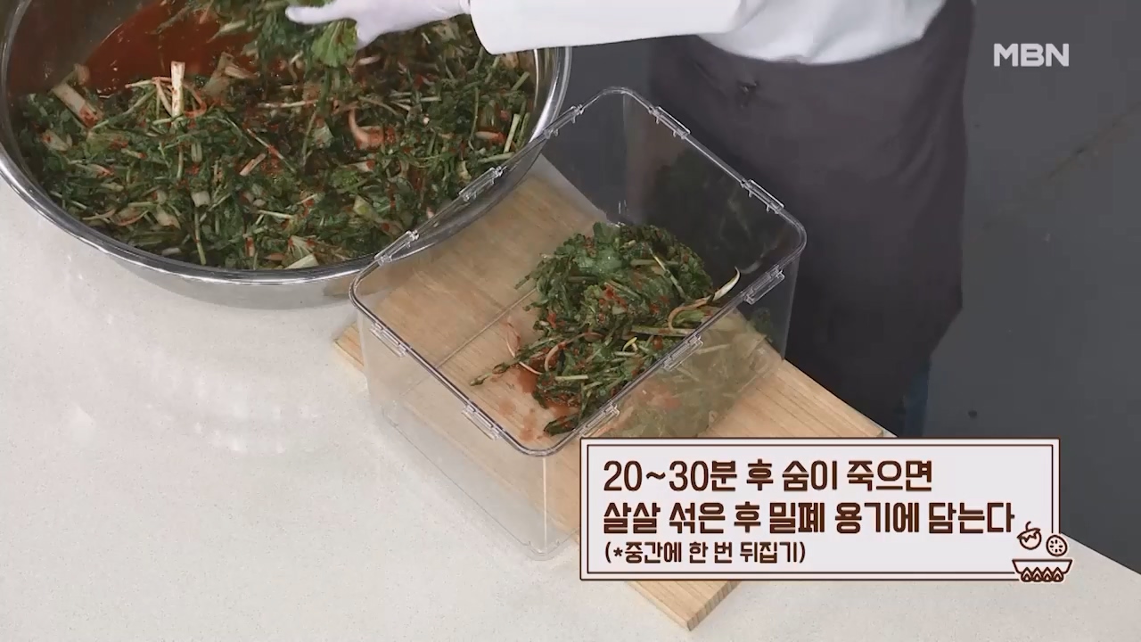 12. 20~30분 후 숨이 죽으면 살살 섞은 후 밀폐용기에 담아주면 맛있는 열무얼갈이김치가 완성됩니다. (중간에 한번 뒤집기)