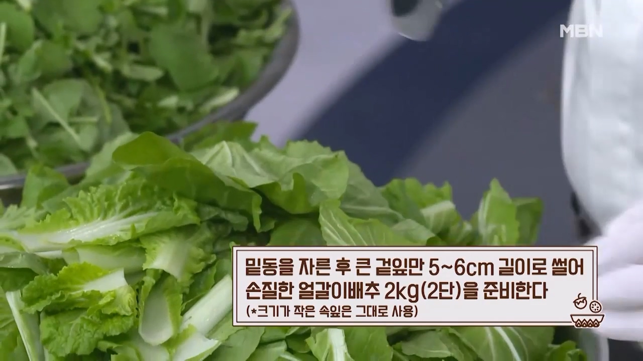 2. 얼갈이는 밑동을 자른 후 큰 겉잎만 5~6cm 길이로 썰어 손질한 얼갈이배추 2kg(2단)을 준비합니다. (크기가 작은 얼갈이 속잎은 그대로 사용합니다.)