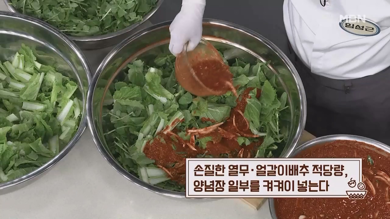 11. 손질한 열무와 얼갈이 배추 적당량에 양념장 일부를 켜켜이 넣어줍니다.