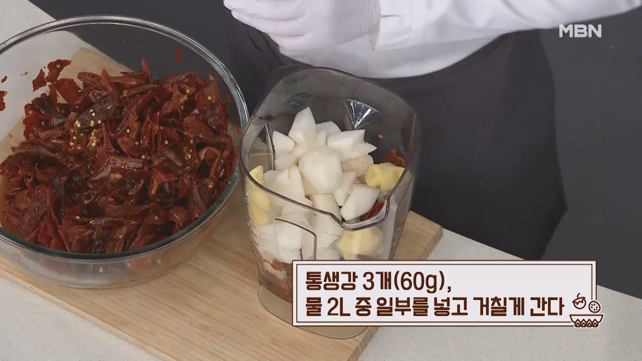 5. 통생강 3개(60g), 물 2리터 중 일부를 넣고 거칠게 갈아줍니다.