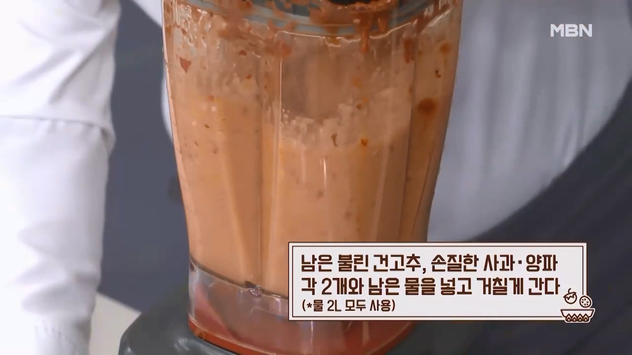 6. 남은 불린 건고추, 손질한 사과와 양파 각 2개와 남은 물을 넣고 거칠게 갈아줍니다. (물 2리터 모두 사용)