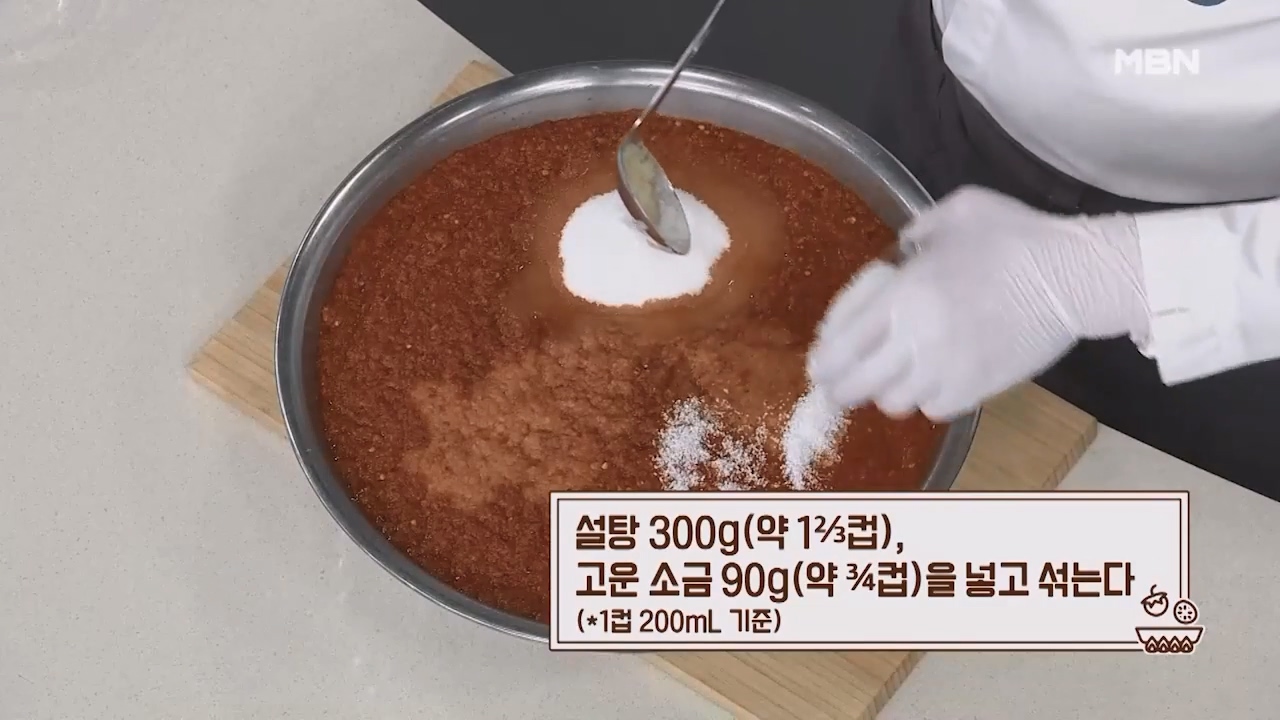 8. 설탕 300g, 소금 90g을 넣고 잘 섞어줍니다. (1컵 200mL 기준)