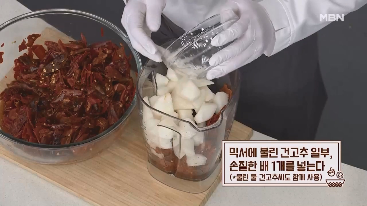 4. 믹서에 불린 건고추 일부와 손질한 배 1개를 넣습니다. (불린 물과 건고추 씨도 함께 사용합니다.)
