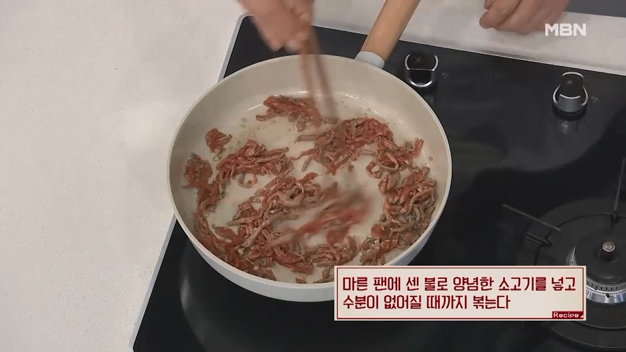 12. 마른팬에 센불로 양념한 소고기를 넣고 수분이 없어질때까지 볶아줍니다.