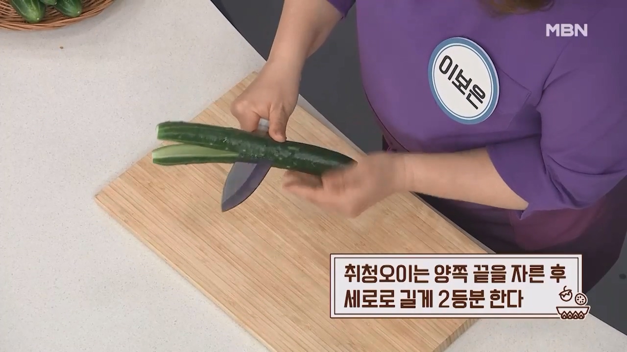 3. 취청오이는 양쪽 끝을 자른 후 세로로 길게 2등분 합니다.