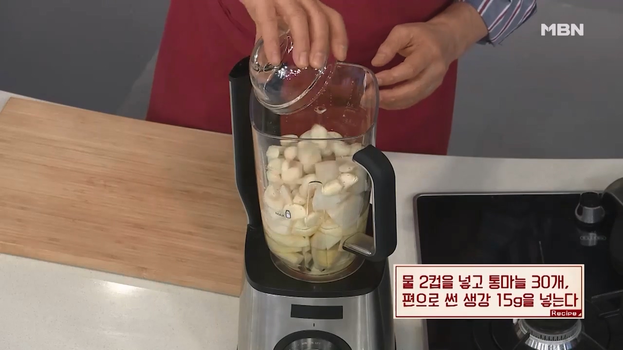 3. 물 2컵을 넣고 통마늘 30개, 편으로 썬 생강 15g을 넣습니다.