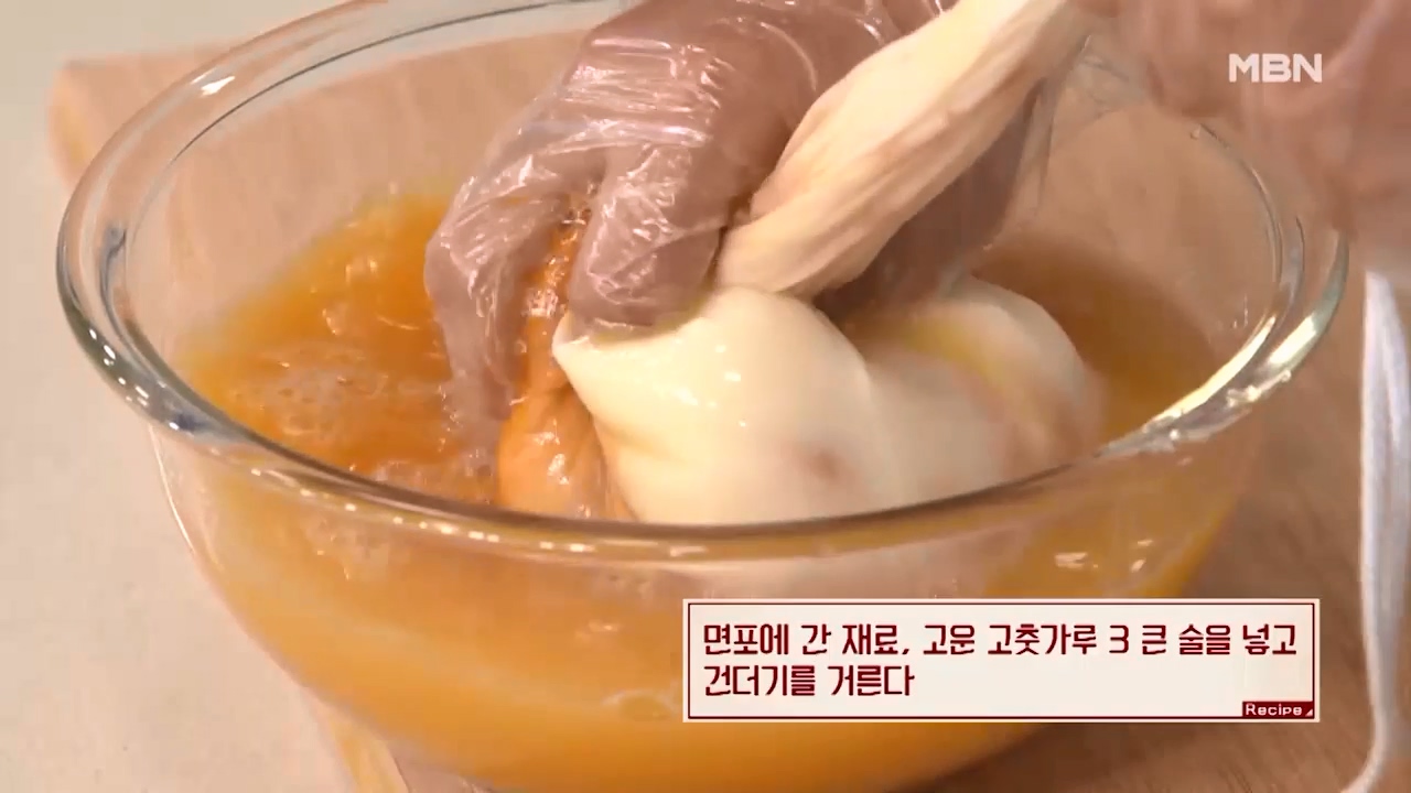 3. 믹서기에 간 재료와 고춧가루 3큰술을 면포에 넣고 짜서 건더기를 걸러줍니다.