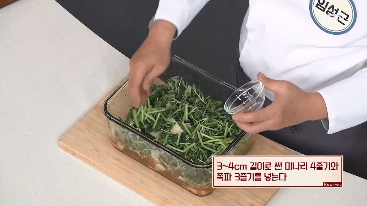 6. 3~4cm 길이로 썬 미나리 4줄기와 쪽파 3줄기를 넣어줍니다.