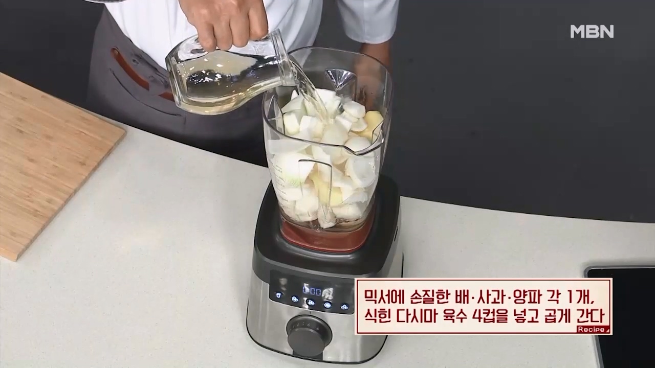 2. 믹서기에 손질한 배 1개, 사과 1개, 양파 1개, 식힌 다시마 육수 4컵을 넣고 곱게 갈아줍니다.